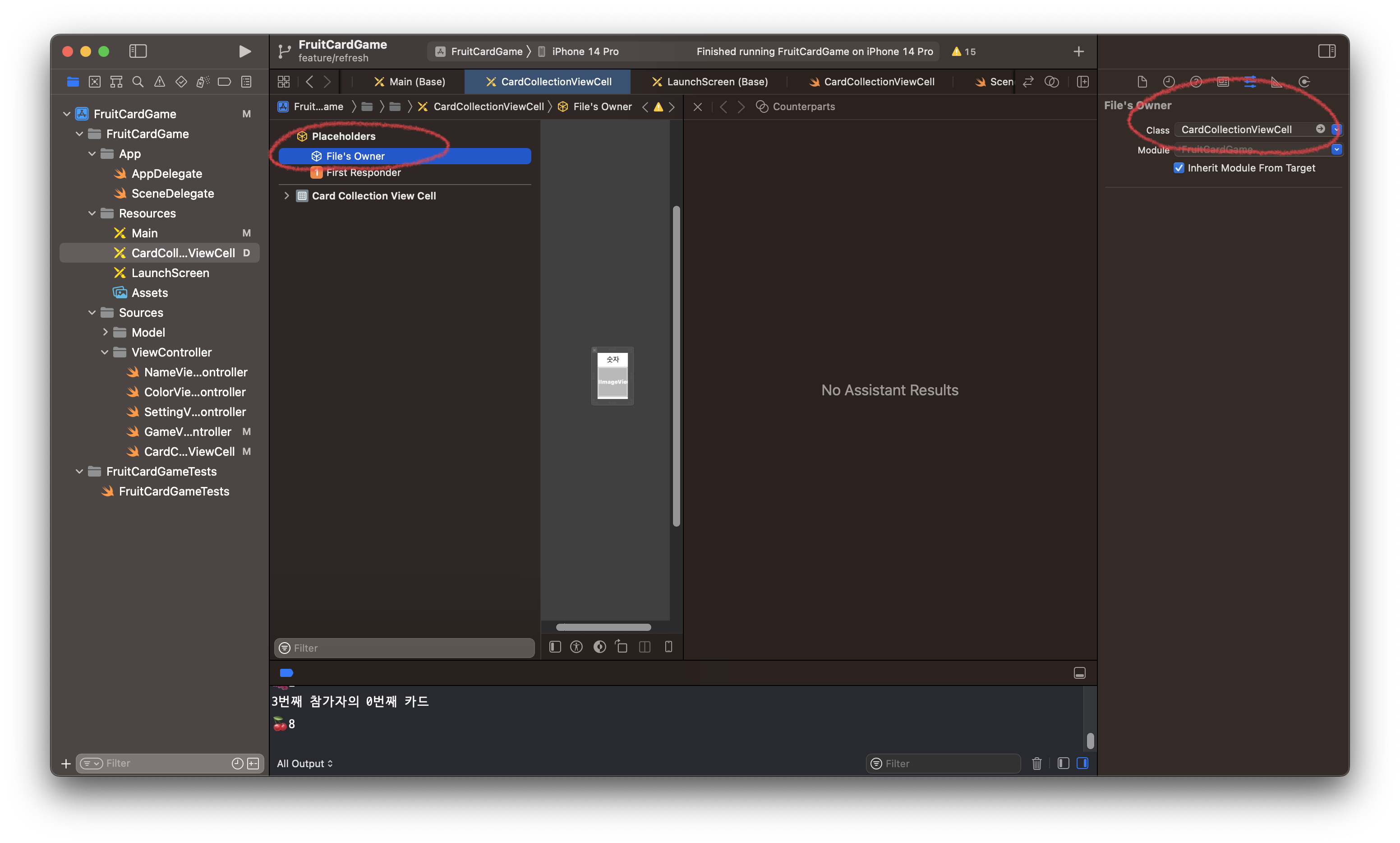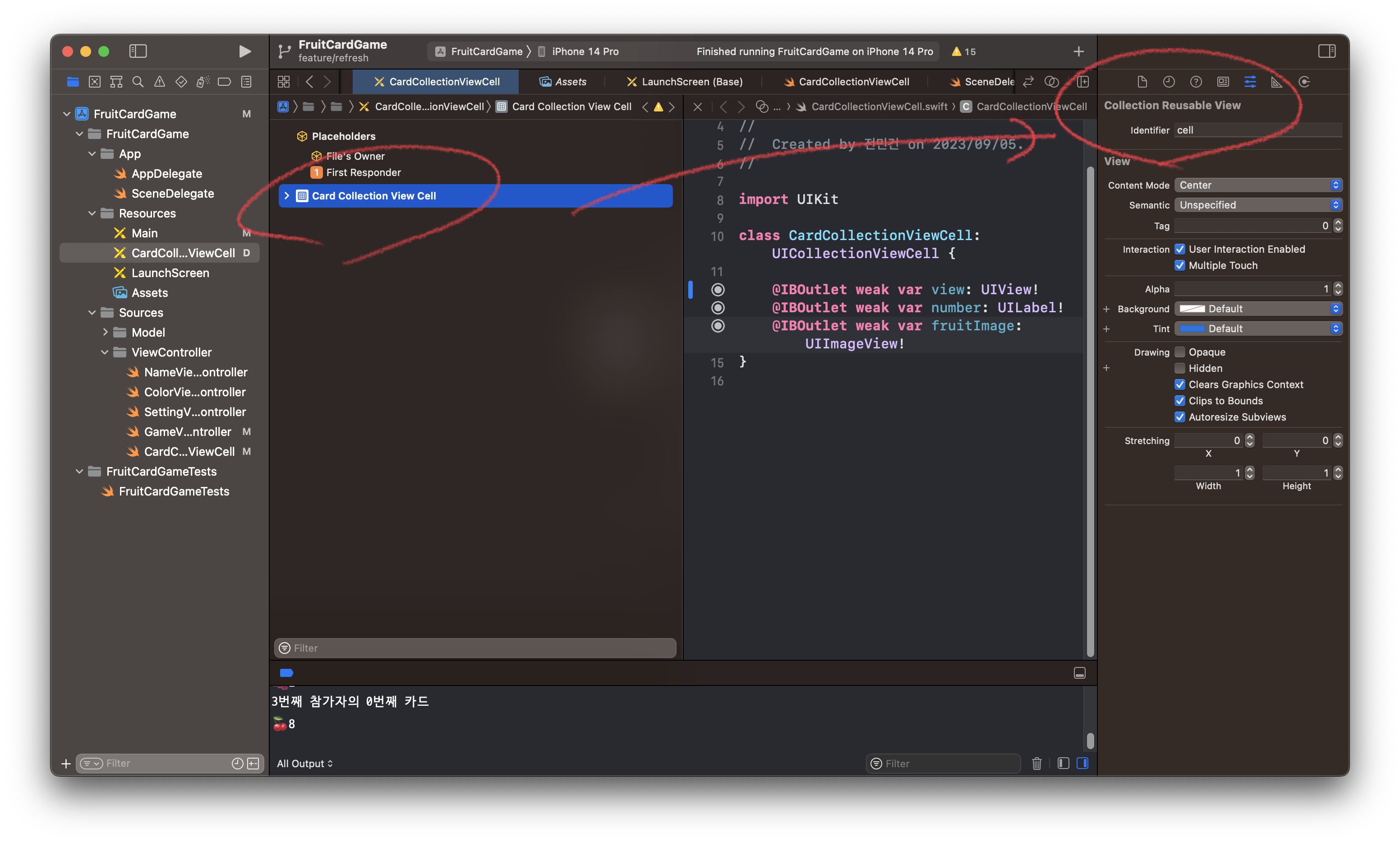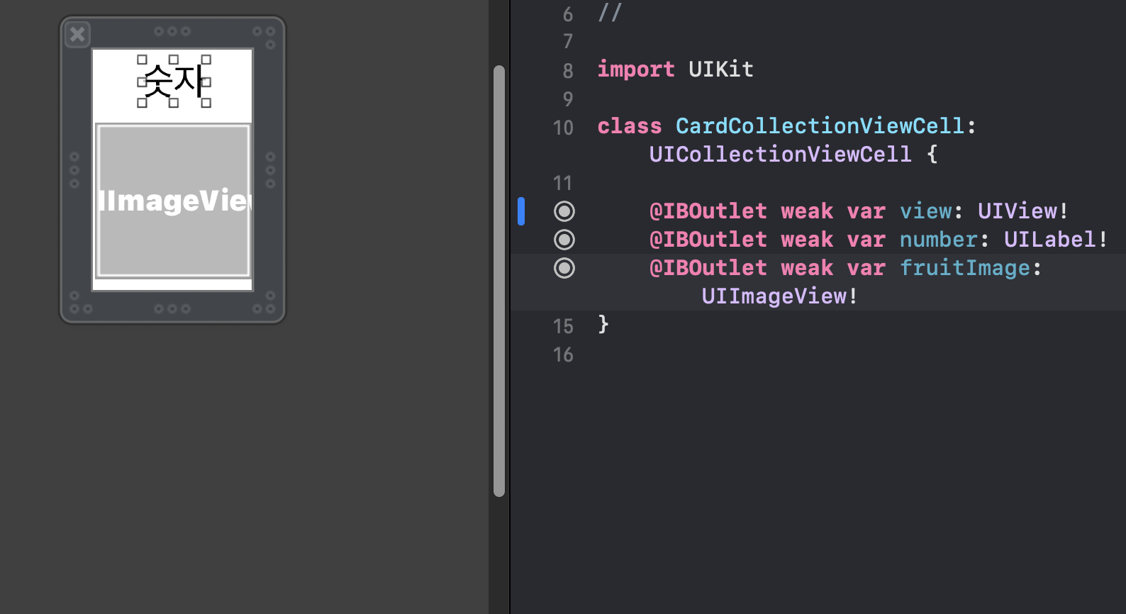 7. collectionView를 사용하는 class 내부 didLoad 밑에 custom cell의 class 이름(여기선 CardCollectionViewCell), 재사용 식별자(여기선 cell) 넣어서 얻은 nib name 으로 collectionView.register 등록